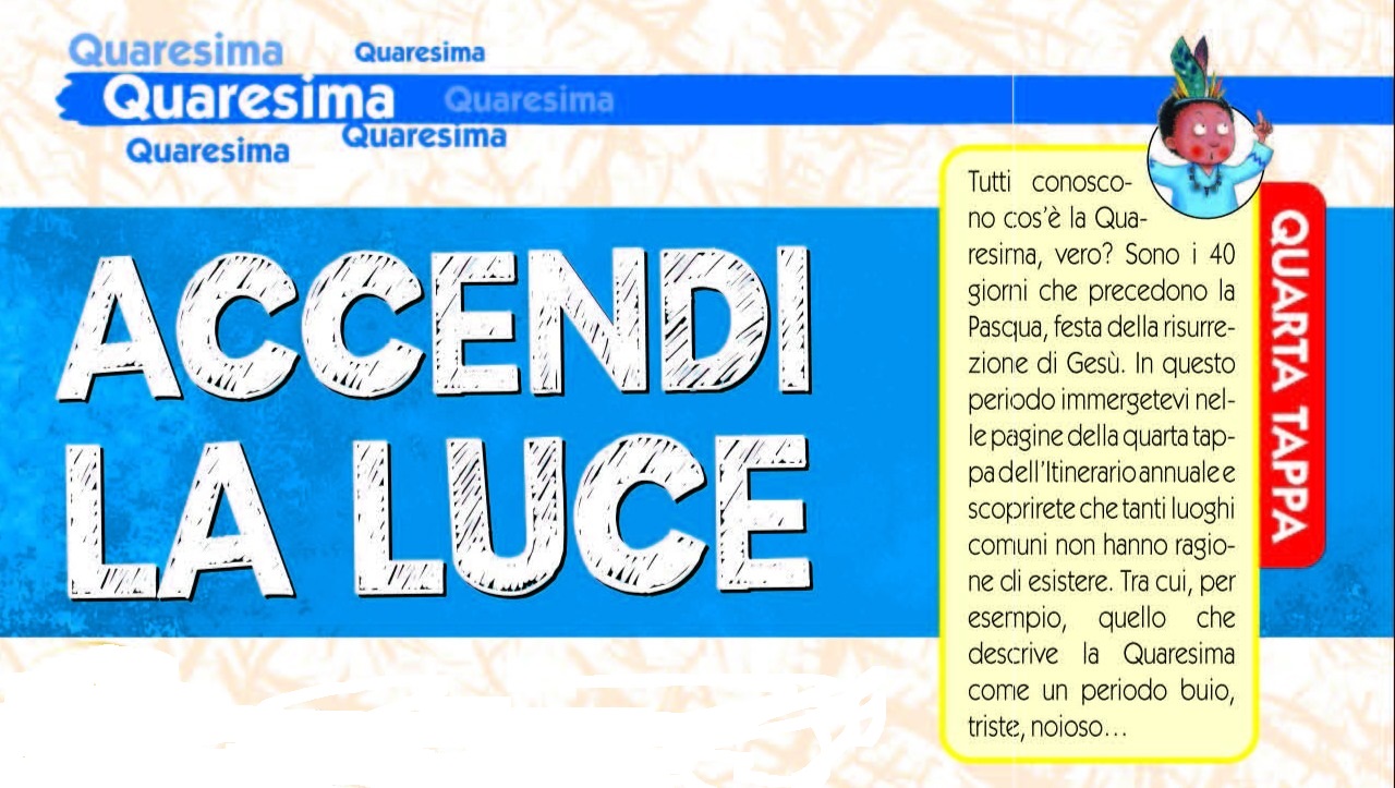 La Parola di Dio di riferimento della quarta tappa è il brano del Vangelo di Matteo (capitolo 5, versetti 14-15) in cui Gesù dice ai suoi discepoli: «Voi siete la luce del mondo; non può restare nascosta una città che sta sopra un monte, né si accende una lampada per metterla sotto il moggio, ma sul candelabro, e così fa luce a tutti quelli che sono nella casa». Segue la meditazione – a misura di bambini – a cura di Loredana Brigante, collaboratrice dell’équipe nazionale Missio Ragazzi.