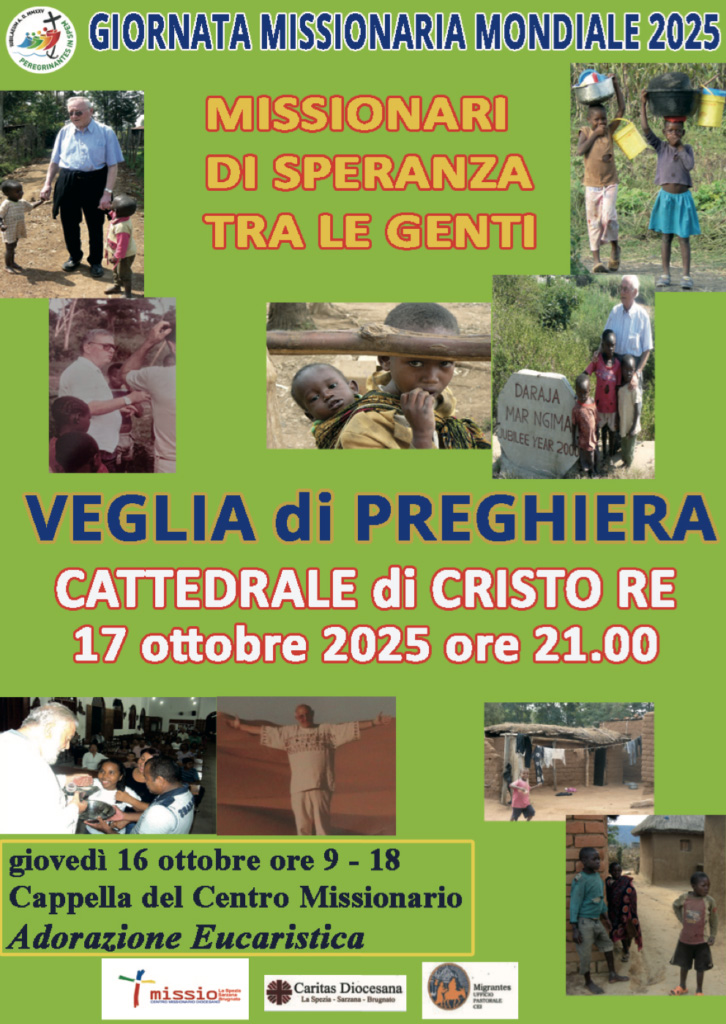 23Venerdi 17 ottobre 2025 alle ore 21,00 nella Cattedrale di Cristo Re alla Spezia si celebrerà la VEGLIA MISSIONARIA DIOCESANA, preparata dal CENTRO MISSIONARIO DIOCESANO dall’UFFICIO DIOCESANO MIGRANTES e dalla CARITAS DIOCESANA, arricchita dalla partecipazione dei giovani della PASTORALE GIOVANILE DIOCESANA. Offrirà la sua testimonianza S. E. Mons Martin Waingue Bani Vescovo di Doba in Ciad, dove hanno vissuto quest’anno un’esperienza missionaria tre sacerdoti della diocesi. L’evento sarà preparato dall’ADORAZIONE EUCARISTICA giovedi 16 ottobre dalle ore 9,00 alle 18,00 presso la Cappella del Centro Missionario.